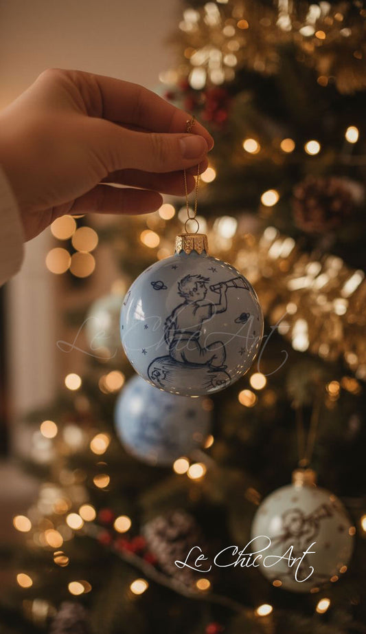 Set 10 Bomboniere Palla Natale Piccolo Principe 8,5 cm - Verde Salvia e Azzurro Polvere dipinta a mano