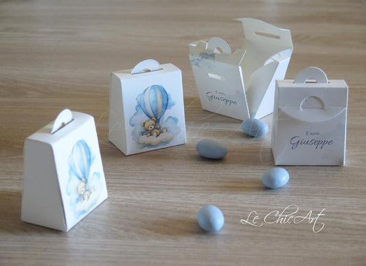 Set 20 Scatole porta confetti Nascita mini shopper con Orsetto in Mongolfiera