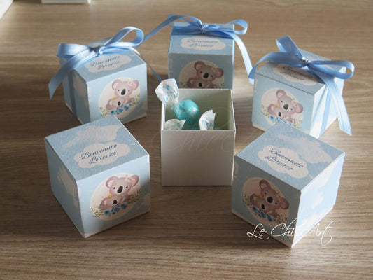 Set 20 Scatole porta confetti cubo nascita cuore di mamma con koala ed elefantino