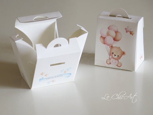 Set 20 Scatole porta confetti nascita mini shopper orsetto e palloncini rosa, azzurro