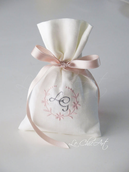 Set 20 Bomboniere Puro Lino Ricamo Personalizzato - Verde Beige e Rosa Cipria Grigio