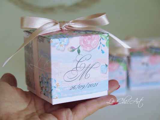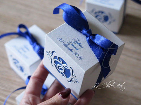Set of 10 vintage cube boxes with initial carving, royal blue or powder pink wedding favors
