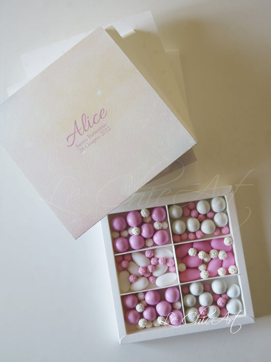 Set of 10 tasting boxes with 6 compartments, personalized pink or blue communion dove.