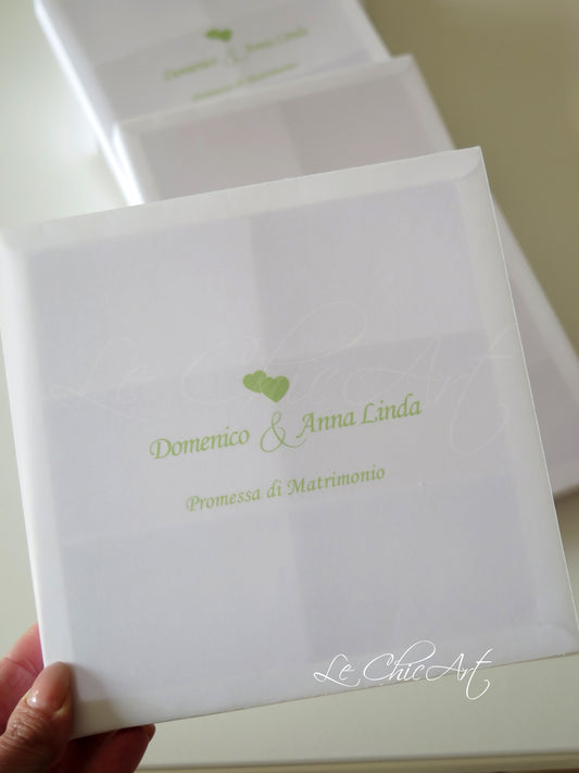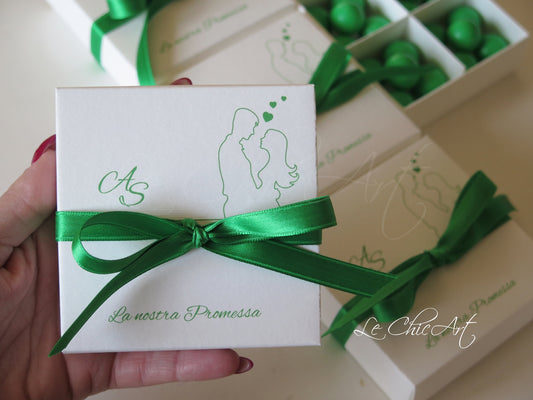 Set of 10 personalized save-the-date wedding promise tasting boxes with 4 compartments