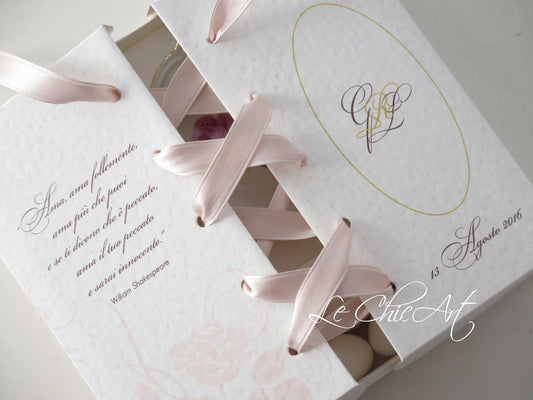 We know how important every detail is to making every event unique and unforgettable. Wedding favors, small symbols of gratitude and affection, deserve a presentation that highlights their beauty and meaning. That's why we've created this special section: a gallery dedicated to the custom packaging we've created for our clients, transforming simple wedding favors into authentic unboxing experiences.